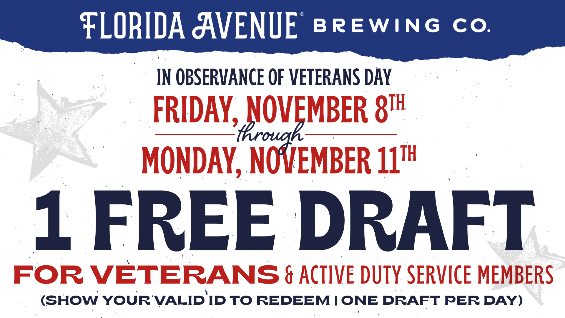 Starting Friday, November 8th our taprooms are offering Veterans and Active Duty Service Members a FREE DRAFT!