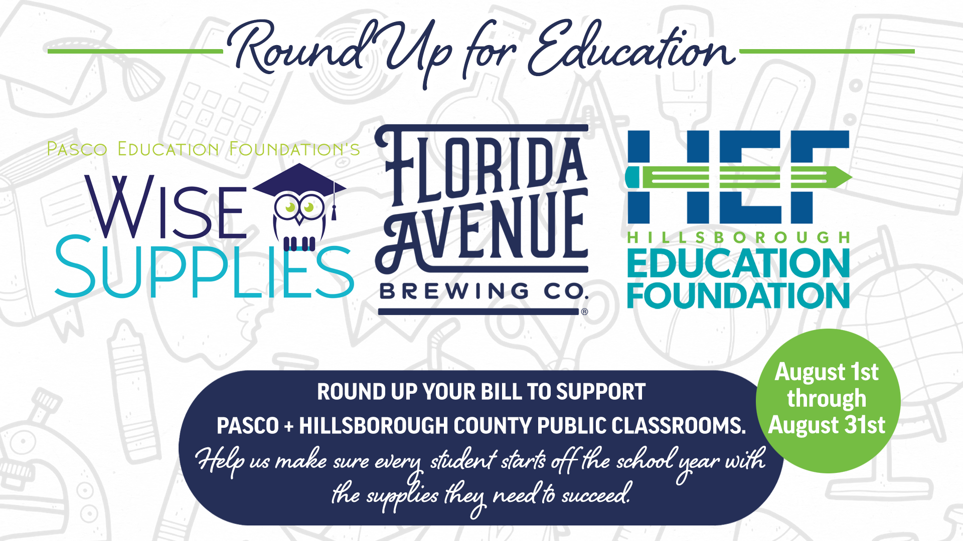 Our Taproom guests will have the opportunity to round-up their bill towards the purchase of school supplies with Hillsborough Education Fund and Pasco Education Fund’s Wise Supplies.