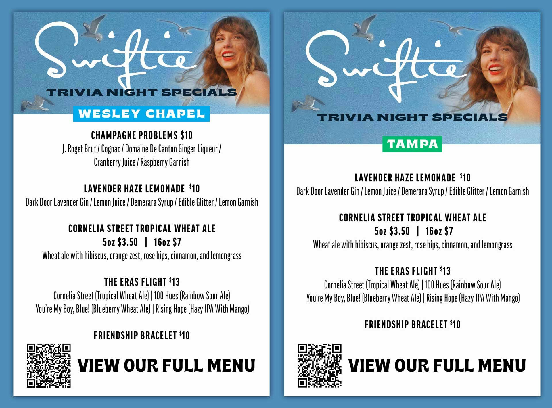 Calling all Swifties! Join Timeless Entertainment for Swiftie Trivia Night on Tuesday, November 21st at 7:30 pm at both our locations in Wesley Chapel and Tampa, FL.