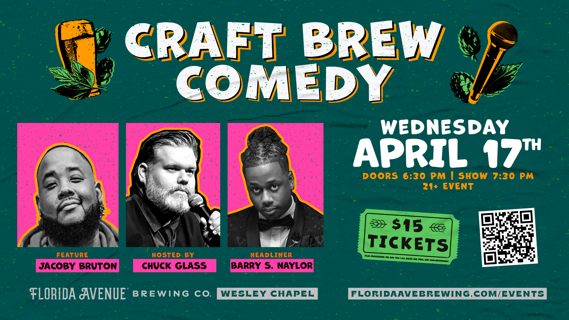 Craft Brew Comedy returns on Wednesday, April 17th in Wesley Chapel! Our host with the most, Chuck Glass will be presenting 2 new talents for the evening in Jacoby Bruton and Barry S. Naylor. Our comedies are always a party with a solid mix of new and returning guests, which is a great opportunity to capture new regulars! As always, a 21+ crowd brings an appetite and THIRST. At only $15 a ticket, it’s an easy date night for your taproom guests!