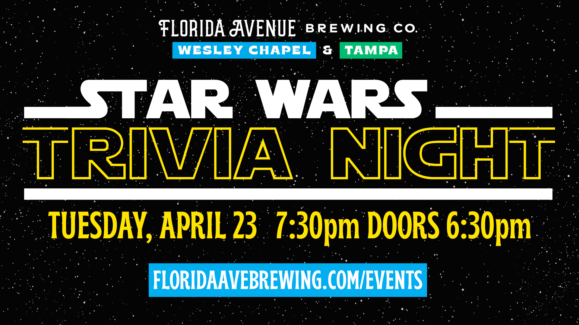 Our Star Wars trivia night is back on Tuesday, April 23rd at both locations, with doors opening to Brewers Hall at 6:30 in Wesley Chapel. In the past, this has been one of our busiest trivia nights and brings all types of folks to the Ave! It should be a fun night full of intergalactic madness and dead parrots, jedi mind tricks and lumis, sith overlords and…well you get the idea. See you all there!