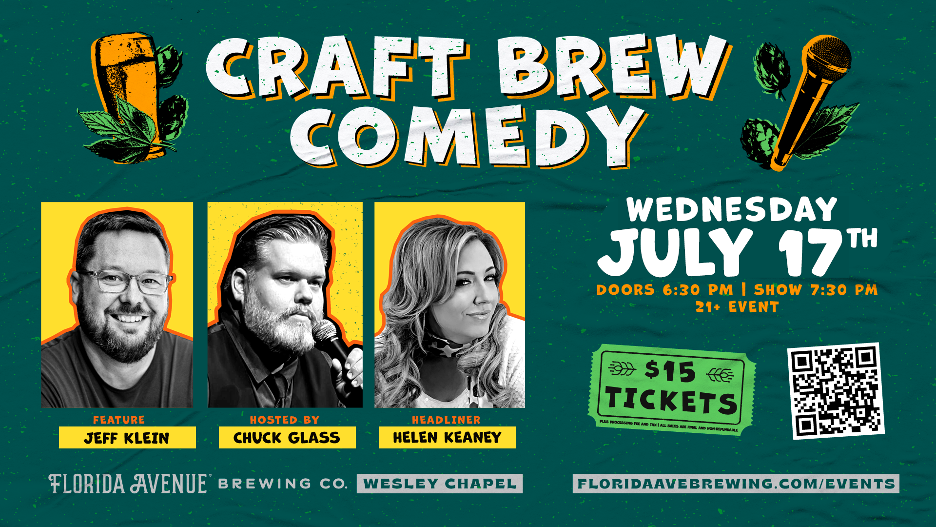 Craft Brew Comedy returns on Wednesday, July 17th in Wesley Chapel! Our host with the most, Chuck Glass will be presenting 2 new talents for the evening in Jeff Klein and Helen Keaney. Our comedies are always a party with a solid mix of new and returning guests, which is a great opportunity to capture new regulars! As always, a 21+ crowd brings an appetite and THIRST. At only $15 a ticket, it’s an easy date night for your taproom guests!