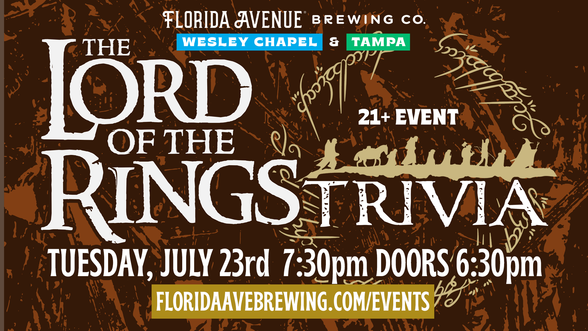 Journey to Middle Earth on Tuesday, July 23rd at both locations, with doors opening to Brewers Hall at 6:30 in Wesley Chapel. This is our first Lord of the Rings trivia nights since Wesley Chapel was born, and we are expecting it brings all types of folks to the Ave! It should be a fun night full of hobbits, orcs and dead parrots. See you all there!