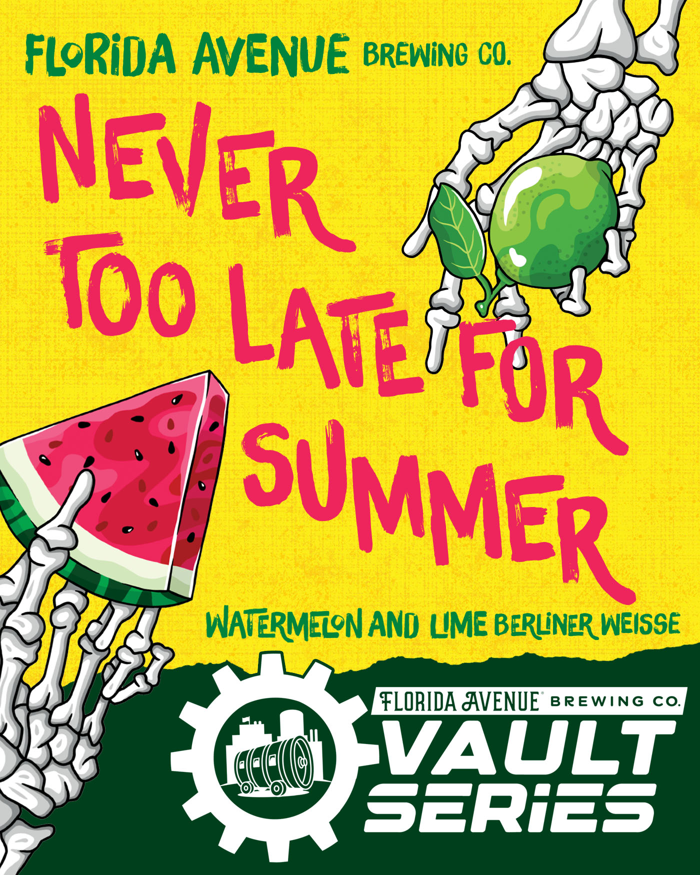 Additionally, on June 28th we began our special beer release program called “The Vault Series”. With the help of our brewer Vinny our goal is to bring back popular beer release favorites from the past that helped put our brewery on the map in this neighborhood! Our first release, Never Too Late For Summer is a Watermelon & Lime Berliner Weisse that did very well for us for years in our old tasting room! We’re pumped for what’s to come with this series!