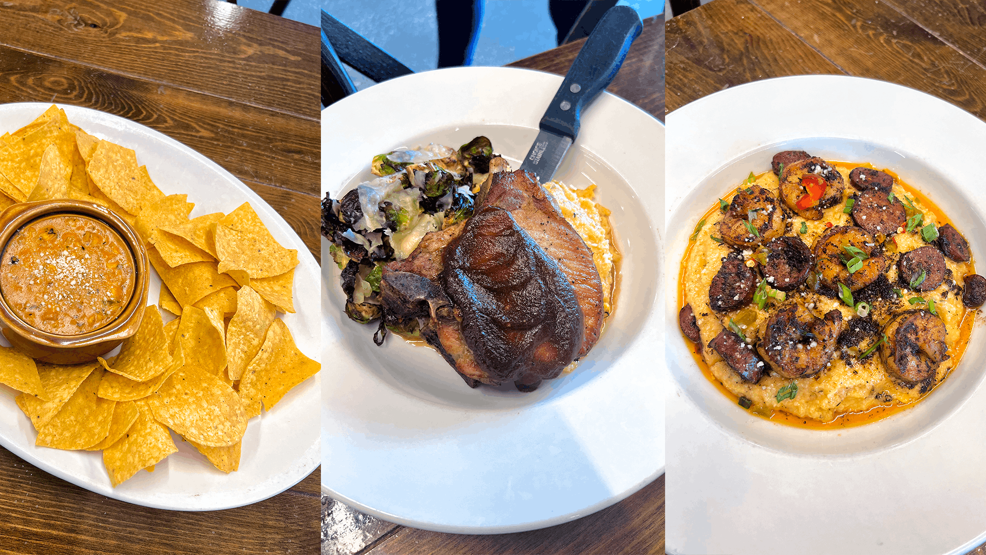 Our Wesley Chapel location will be featuring a new fall menu on October 4, 2023! Pictured below are the elote queso dip and chips, a 12oz. bone-in pork chop, served with seasoned grits and roasted brussel sprouts with shaved parmesan cheese and the highly-anticipated new entree, shrimp and grits.